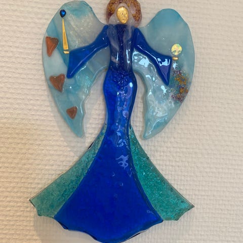 Sæt bestående af fire dekorative vægophæng med forskellige træmotiver. Hvert ophæng har en kæde til ophængning og en rektangulær form med afrundede hjørner. Farverne inkluderer grøn, blå, brun og gul. Materialet ser ud til at være glas eller plastik med printede motiver. Velegnet til vægdekoration i hjemmet.