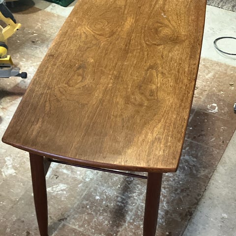 Fint sofabord i massivt teaktræ med københavnerudtræk (bordpladen kan løftes op, så bordet bliver højere). Temmeligt smadret bordplade efter små børns leg, men den kan sagtens blive fint med en slibning og oliering. Sælges kun pga pladsmangel efter flytning.