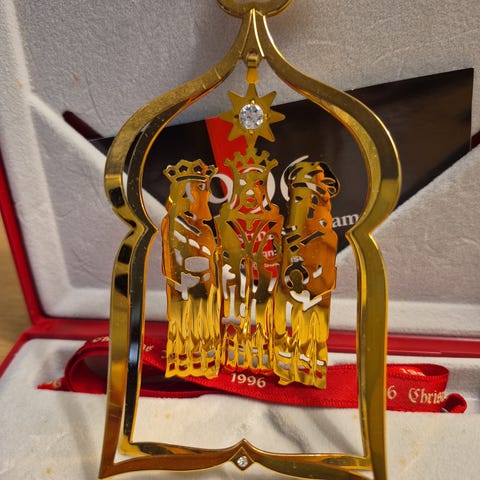 Med æske og bånd. Et lille stykke er klippet af båndet. Se foto