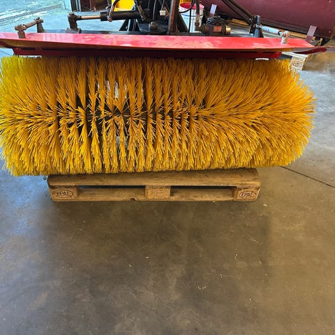 Karlo Nielsen 920 Skærping kostemaskine med metalramme og gul børste. Maskinen er designet til rengøring og fejeopgaver og har en robust konstruktion til industriel brug.