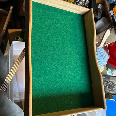 Terning bakke i grøn. Hæklet kant med træbund dækket af filt. Håndlavet af mig.