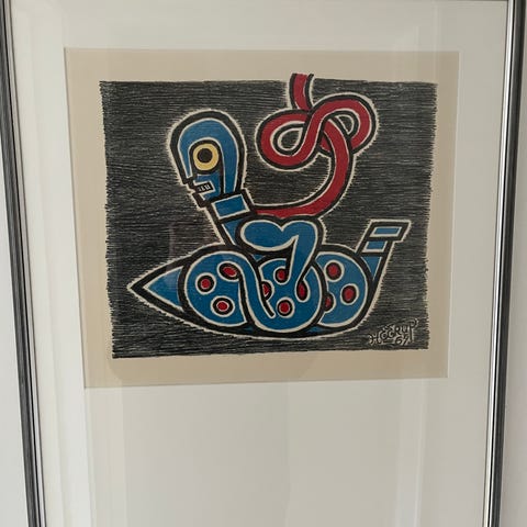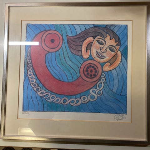 Motivet hedder måske Hymne til foråret. Øsknen i venstre side har været løs og er sat fast med plastisk træ. Har hængt sådan i årevis, så det fungerer fint. Ramme: HxBxD: 47,5x51,5x1,5 cm. Indvendig passepartout: HxB: 31x36cm.