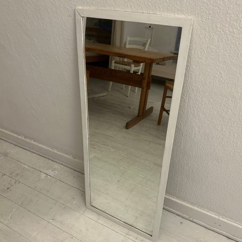 Gammelt hvidmalet spejl med facetslebet kant. 60 cm høj og 43 vm bred.