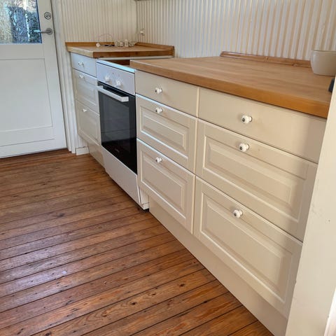 IKEA køkkenvogn med hylder og skuffe i træ og hvid