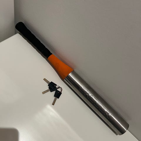 Denne genstand er en ratlås designet til at forhindre biltyveri ved at blokere styringen af bilen. Den har en gul håndtag og en grå metaldel, der kan monteres på rattet. Ratlåsen kommer med en nøgle, hvilket gør den let at låse og oplåse. Størrelsen på låsen er 40 cm. Tags: ratlås, bilsikkerhed, biltyveri.