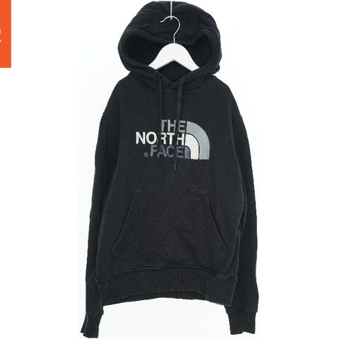 En olivengrøn hættetrøje med langærmet design. Forsiden har en stor hvid logo-tekst trykt med 'THE NORTH FACE'. Trøjen har en rummelig kængurulomme foran og en hætte med dobbelt lag stof. Materialet ser ud til at være blødt og komfortabelt.