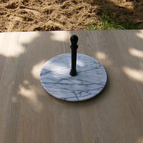Dette er et servietstativ lavet af marmor og metal. Det har en rektangulær base med dimensioner 12x17x17 cm, og en metalbøjle der holder servietterne på plads. Basen er flad og består af to lag marmor, hvilket giver en solid og stabil konstruktion. Servietstativet står på fire små fødder, som hjælper med at beskytte underlaget.