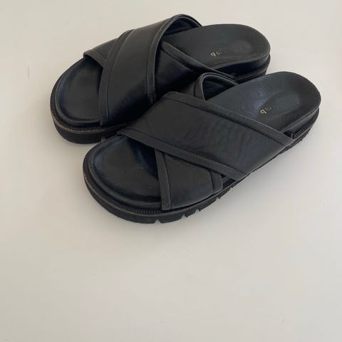 Dette er et par sorte flade sandaler, størrelse 37, med brede, krydsende stropper over foden. Sandalerne har en robust, rillet bund for ekstra greb og komfortabel støtte. Fremstillet af læder, ser de ud til at være fra mærket Phenumb Copenhagen, som også er synligt i sålen. Den minimalistiske stil gør dem velegnede til afslappet og hverdagstøj.