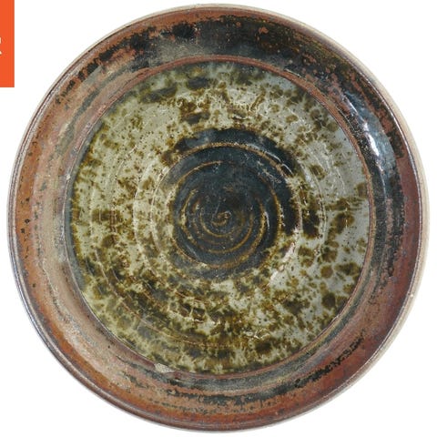 Dette er to runde skåle af keramik, med en diameter på 12 cm. Skålene har en blank brun glasering og en sort kant. Undersiden af hver fad har en synlig stempel. Kan bruges til forskellige formål i køkkenet, f.eks. som serveringsfade.