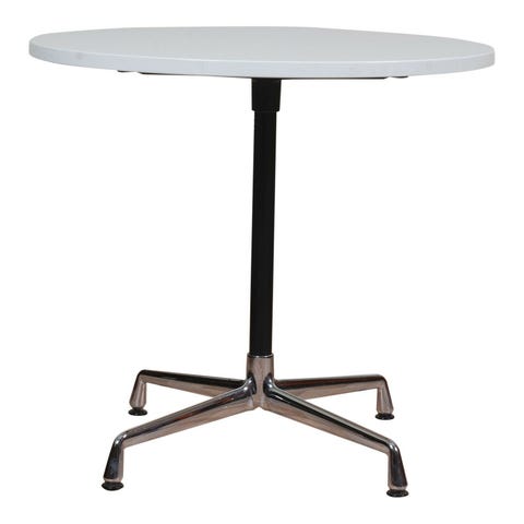 Det originale bord i god patineret stand. Bordpladen er med hvid gummikant hele vejen rund. Melaminen har enkelte små afslag i kanten som nemt kan gøres mindre synlig. Foden er i forkrommet støbt aluminium og noget af krommen er skallet(se billeder). Derfor den lave pris