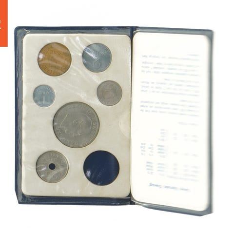 Dette er et sæt af danske mønter, som er indlejret i separate plastiklommer i en lodret opstilling. De fremstiller forskellige årstal og værdier, og inkluderer en særlig pakke markeret som 'DANMARK 1974'. Hver mønt vises tydeligt på begge sider gennem gennemsigtig plast. Det samlede opbevaringslayout er cirka 20 cm i længden.