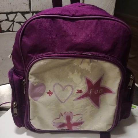 En lys blå rygsæk med et trykt motiv af en abe i rødt outfit og teksten 'MONKY TONKY'. På forsiden ses også et logo, der ser ud til at være 'Landia'. Tasken har en lynlåslomme på fronten samt lynlåslukning til hovedrummet. Stropperne er justerbare for at passe barnets komfort. Rygsækken måler cirka 34x29 cm.