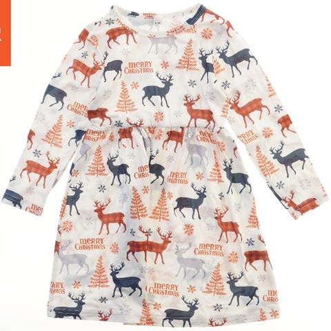 En børnekjole med beige overdel og en skørt dekoreret med et print af rensdyr og sneklædte landskaber. Kjolen har korte ærmer og en stor sløjfe på forsiden af skørtet. Der er en lynlås på bagsiden for nem af- og påtagning.