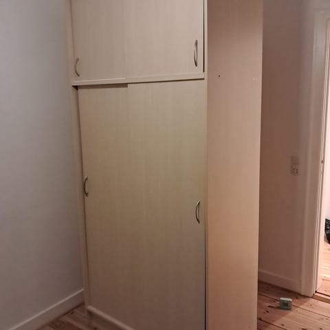 Skabet gives væk gratis under forudsætning af at du selv sørger for at skille det ad, og bære det ud. Det står I stue etage tæt på hoveddøren. Jeg tror det skal skilles ad for at komme ud, og for at undgå at ødelægge det.