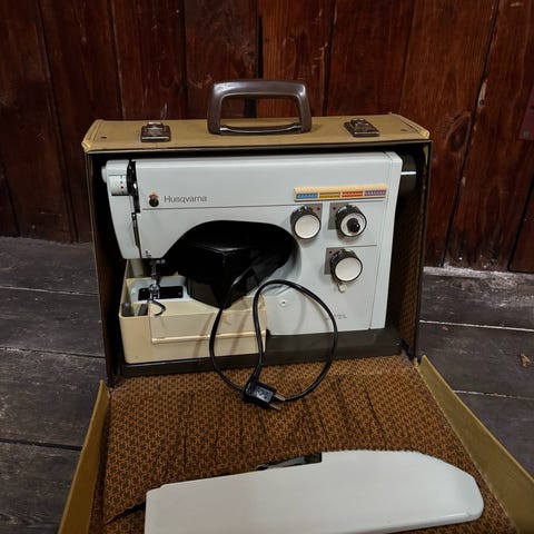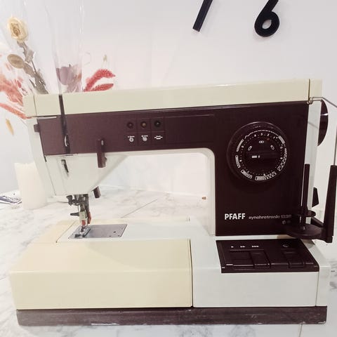 PFAFF sygmaskine med sytråd og spolere.