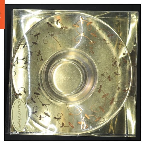 Dette er en glas fyrfadslysestage med dekorative mønstre. Det centrale område er hævet for at holde et fyrfadslys. Designet inkluderer fine blomsterlignende mønstre rundt om kanten. Fyrfadslysestage kommer i en gennemsigtig æske, der også kan bruges til opbevaring eller beskyttelse af stagen, når den ikke er i brug.