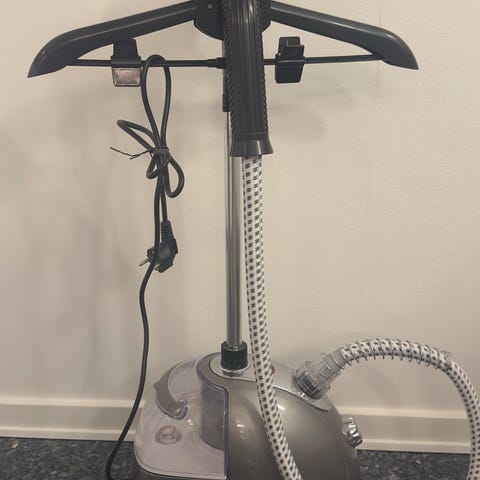 Denne dampstryger er designet til effektiv og hurtig strygning af tøj. Den har en rund beholder til vand og en lang slange med et strygehoved i enden. Den kommer med et strømstik og to stålrør, der formodentlig kan være en del af en støtte eller base. Dette apparat er ideelt til at fjerne krøller fra tøj hurtigt og med minimale anstrengelser. Tags: damp, stryger, tøj