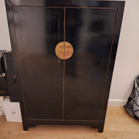Antik træskab med dekorative motiver på fronten. Skabet har 2 rum med døre. I hvert rum er 1 hylde. Købt i Green Square for 13.500 kr. Kvittering haves. 190x73x44,5. Øverste rum h41, midterste rum h77, nederste rum h43.