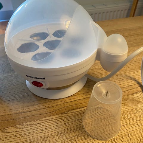 Denne elektriske æggekoger kan koge op til seks æg ad gangen. Den er i en kompakt størrelse på 26x19 cm med et gult plastik ydre og en gennemsigtig låg. Æggekogeren er udstyret med en ledning til strømtilslutning og har en simpel betjeningsknap på toppen til justering af processen. Den er velegnet til køkkenbrug og sikrer ensartet kogning af æggene.