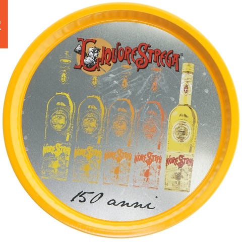 Den viste bakke er en firkantet bakke med en størrelse på 34x34 cm. Den er forsynet med et vintage design, der viser et flaskemotiv med Rhum Negrita rom spiritus og cocktailglas. Bakken ser ud til at være lavet af metal og har en sort kant, der indrammer designet. Bagsiden af bakken har tydelige brugsspor og ridser, hvilket indikerer, at den har været brugt en del. Tagene på bakken, der forestiller en aftenscene med flasker og glas, giver et retro udtryk.