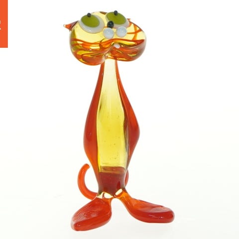Håndlavet glasfigur forestillende en hund med gennemsigtig gul krop og lilla detaljer, herunder ører, hale og poter. De hvid-glaskugler øjne og næse giver figuren et tegneserieagtigt udtryk.