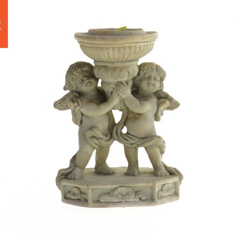 Lysestage med tre figurer, der forestiller engle siddende ryg mod ryg. Lysestagen er lavet af hvidt porcelæn og har en rund skål i midten til et bloklys eller en anden type lys.
