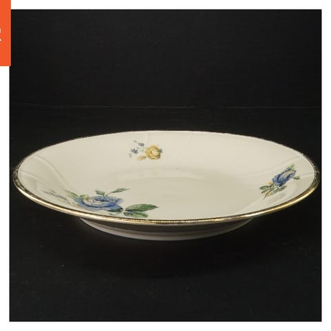Et ovalt serveringsfad i hvidt porcelæn med gyldne kanter og dekorative detaljer.