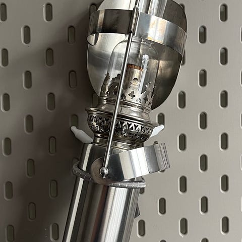 Stilren, stor olielampe fra danske Stelton. Lampen er designet af Erik Magnussen, som også bl.a. har designet Steltons berømte termokander. Lampen kan anvendes både ude og inde den er fremstillet med fod, brænder og cylindrisk beholder i rustfrit stål. Klassisk lampeglas i klart glas og skærm i gennemskinneligt, mælket plexiglas. Den originale emballage medfølger. Højden er 26 cm og diameter 13,5 cm. Står på Mols men kan gratis leveres I Aarhus og Ebeltoft eller sendes billigt på købers regning.