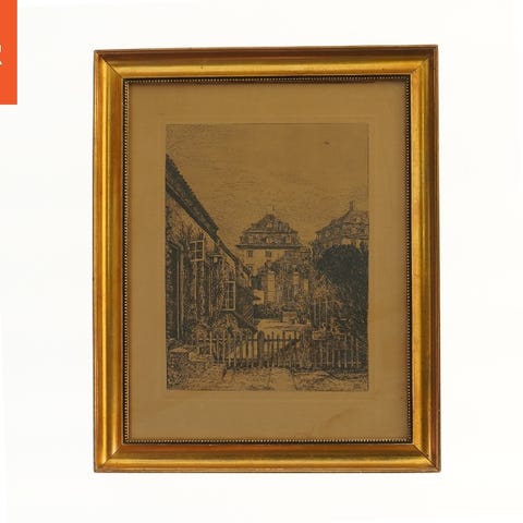Dette er en indrammet sort/hvid koldnålsradering af et landskab med et hus og træer “Gadeparti Skagen” af Carl Bloch. Rammen er lavet af træ med en gylden finish. Bagpladen har en ophængningssnor monteret. Tegningens størrelse er 42x30 cm.