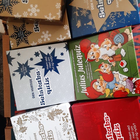 Denne genstand er en lille, firkantet metaldåse med mærket 'Box Quiz'. Forsiden viser ordet 'JULE KALENDERE', og ser ud til at indeholde quizspørgsmål. Bagsiden indeholder information om målgruppen og anbefalinger for brug. Dåsen kan anvendes som hjernevridere i lommeformat og er ideel til rejser, fester og eftertanke.
