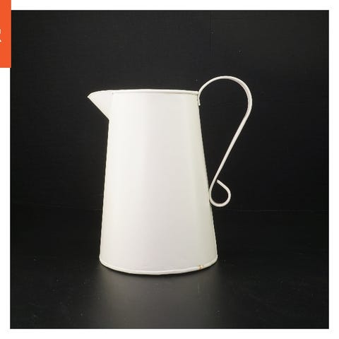 En dekorativ kande fremstillet af sølvfarvet metal med en ornamenteret kant og detaljerede fodstøtter. Kanden har et enkelt håndtag og et åbent topdesign, hvilket gør den velegnet til servering af væsker. Størrelsen er 10 cm i højden.