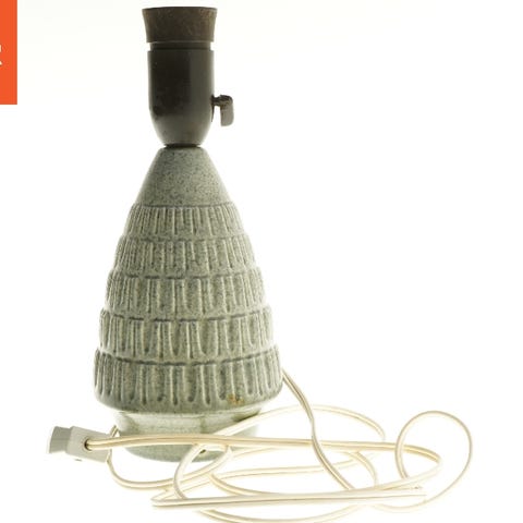 Bordlampe uden skærm, fremstillet i hvidt materiale med en ledningsledning. Lampens base har en tekstureret overflade, og skærmen har en unik foldet struktur i beige papir eller pap. Lampen har en klassisk fatning til en lys-pære. Den medfølgende skærm passer over fatningen og giver en varm belysning.