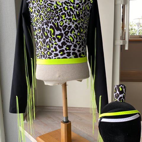 Discodragt, helt ny lycra top uden glimmer fra Discodragter.dk, str. 8-10 år ca.. Neongul top med spiralfrynser på ærmer og forstykke.