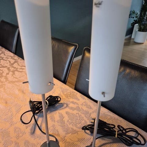 Dette er et sæt af moderne bordlamper med cylindriske hvide lampeskærme og en krom base. Lamperne har en højde på 44 cm og kommer med tilhørende ledninger med stik til strømforsyning. De er designet til at give et blødt, diffust lys, ideelt til stue eller kontor. Lampeskærmen er lavet af et mat hvidt materiale, mens basen er lavet af skinnende krom, hvilket giver et stilfuldt udseende.