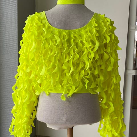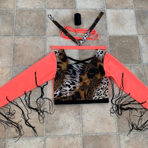 Discodragt, helt ny top i lycra uden glimmer fra www.discodragter.dk, str. 12-14 år ca. Gul leopard mønstret forstykke og ryg. Sorte ærmer med tynde neongule frynser. Der følger hårtårn, 3 hårbånd og halsbånd med. Sæt selv leggings til.