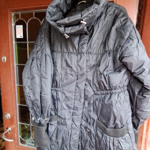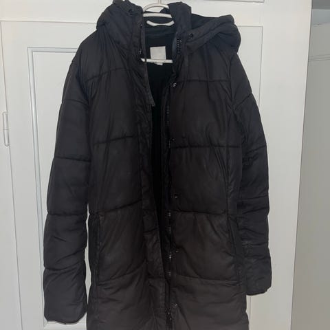 Dejlig varm vinterjakke med hætte. Går til lige over knæene. Brugt et par gange, men fejler ingenting og bærer ikke præg af brug