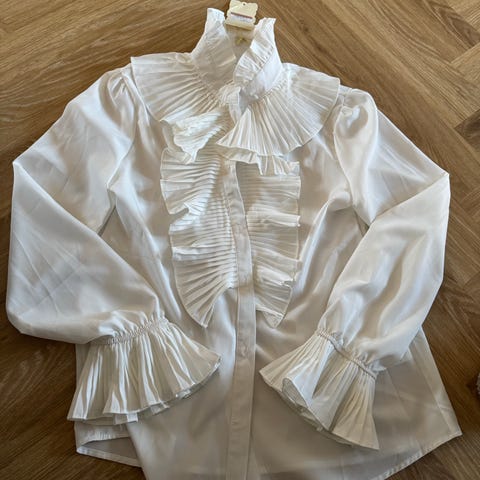 Flæseskjorte med puf ærmer med rynkeeffekt. Skjorten har stolpeåbning og høj hals med flæsekant.