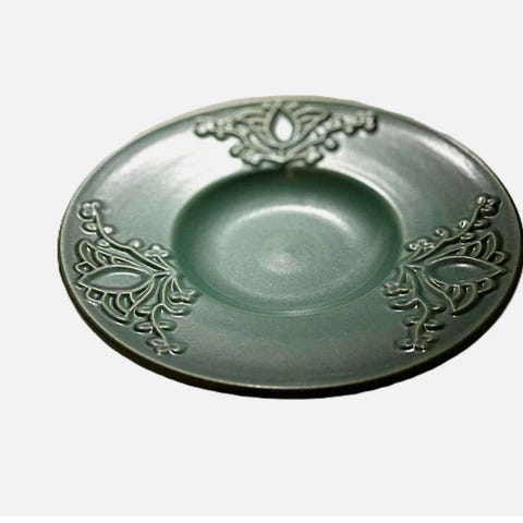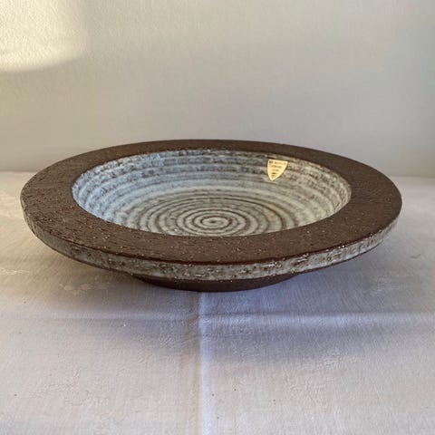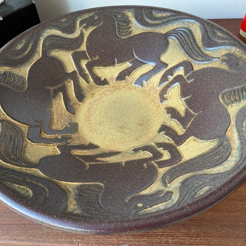Stort velholdt bordfad på 31 cm i Persiaglasur med motiv fra Østerlars Kirke på Bornholm, formentlig fra 1948.