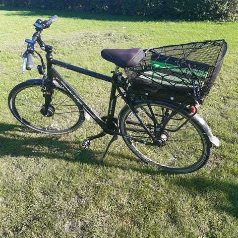 Bycykel til mænd i grøn farve. Cyklen har et klassisk stel med lige styr og er udstyret med bagagebærer. Den er designet til daglig brug og transport.