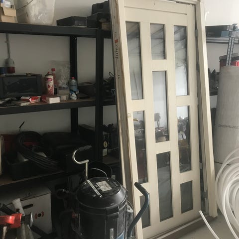 Snedker-lavet hoveddør, inkl 114mm karm, mulighed for at sætte glas eller træ i åbninger, træ til lister, åbninger etc følger med, alle beslag etc følger med, også isolering til åbninger. Mål: 945B x 2120H x 114D mm