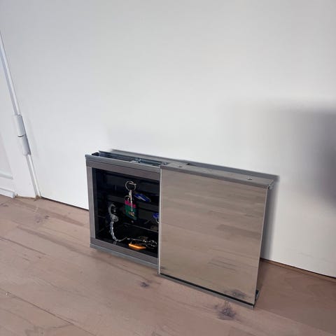 Skabet har en diskret magnetlås og seks kroge til nem opbevaring.