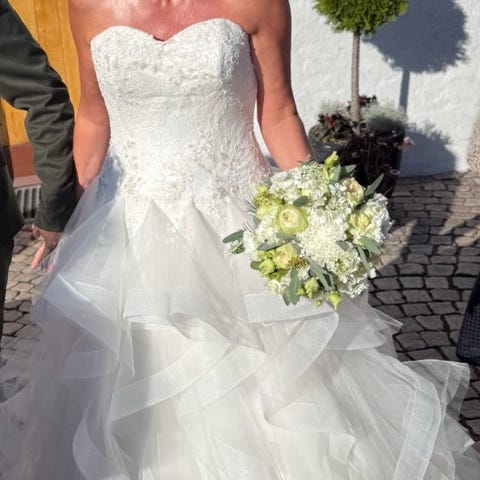 Smuk unik brudekjole i det franske mærke pronovias. Hver enkelt blomst er håndsyet på. Det er en størrelse 34. Den er lagt op hos skrædder og passer derfor mig på 162cm med 6cm hæle.