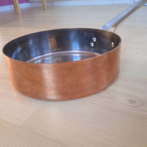 Georg Jensen kobber pande med rustfri stål indvendigt. Velegnet til madlavning med god varmeledningsevne. Panden har et langt håndtag i rustfrit stål.