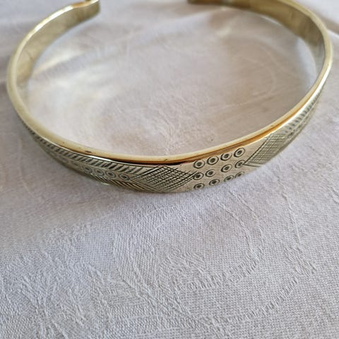 kraftig ,tykkelse ca 0,7 cm, diameter ca 18 cm, lige afskåret i enderne. Messing,kan pudses ,med pudsemiddel eller bare citron, Jeg har ikke brugt den,ved ikke om den har været brugt.Oprindelig købt for 20 år siden i burma,af de højhalsede kvinder. +porto 43 kr gls med tracking.Send besked