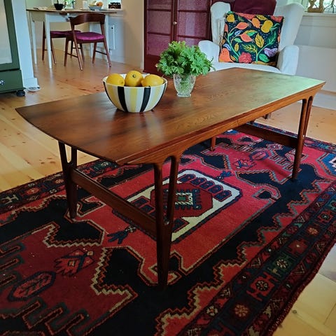 Smukt sofabord i ægte palisander med meget flot og levende åretegning. Klassisk dansk design fra midten af 1900-tallet, udført i høj kvalitet.