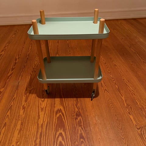 Fint rullebord, der har en lille plade der kan slås op så bord er 44x62 cm. Hylder kan vendes og bruges til vinflasker.
