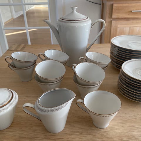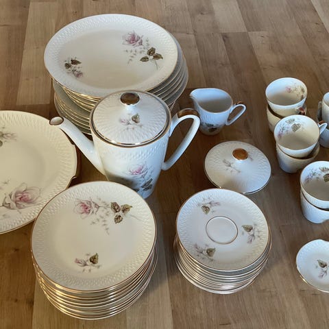 Ialt: 10 kaffekopper, 11 underkopper, 12 sidetallarkner, 1 Fad, 1 Opsats, 1 Kaffekande, 1 Chokoladekande, 1 Fløde og sukkerskål, 2 små skåle.