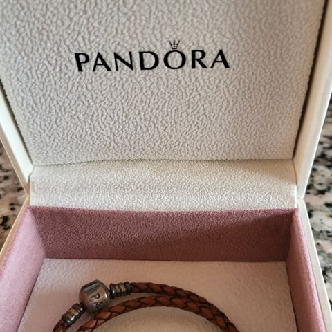 Pandora armbånd til kvinder, fremstillet i læder. Armbåndet inkluderer 13 stk sølvcharms samt 1 gikdcharms med forskellige designs, monteret på en læderrem.