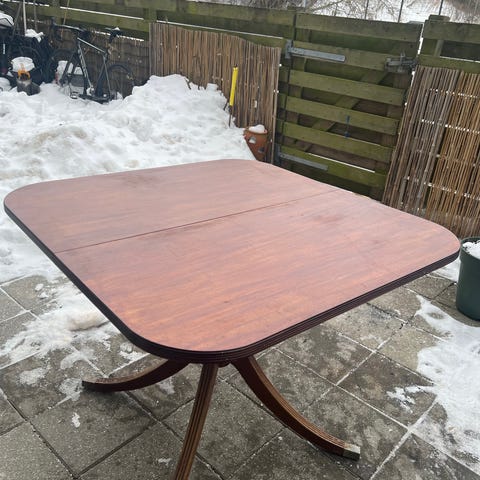 Et ældre hobbylavet spisebord lavet af min grandonkel. Ligner ibeholt træ, men ikke helt sikker. Bordet består af en midterplade, knyttet til to plader, der kan foldes ned. Har lakeret overflade. Et par mindre ridser hist og her.