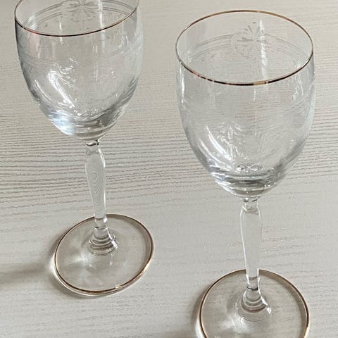 2 stk. rigtig flotte gamle krystalglas med guldkant på overkanten og rundt langs foden. Facetslebet glas med flot mønster,
